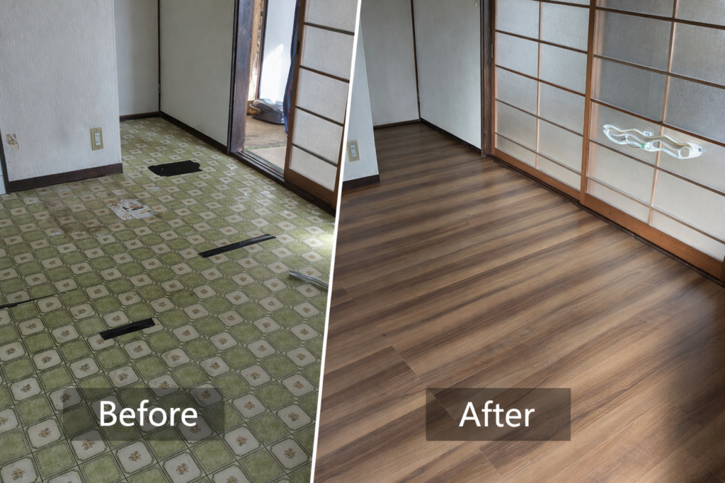 佐賀市北川副のアパートで、経年劣化したキッチン周りの床をフローリングで張替えた施工事例です。入居中の工事対応、二重張り構造による強度アップ、費用165,000円(税込)など、アパートのフロア工事を検討中の不動産会社・管理会社の方の参考になる内容をまとめています。