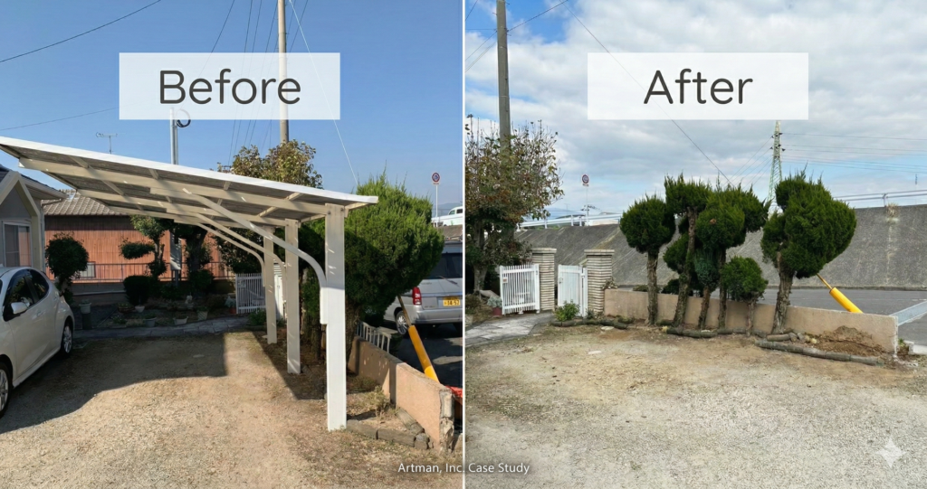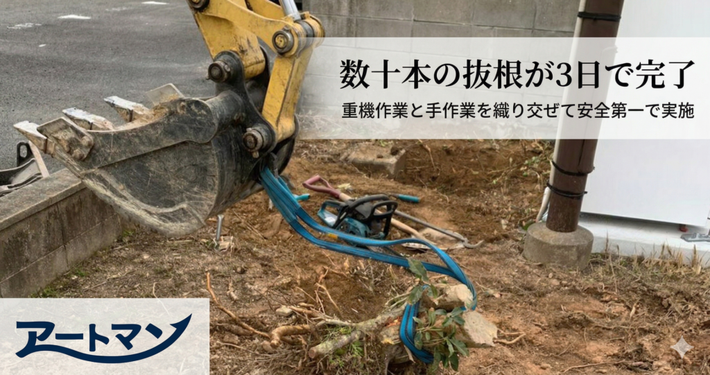 武雄市の集合住宅共用部で切り株・根を数十本分撤去した抜根作業の施工事例。重機と手作業を使い分け、地中配管に配慮しながら3日間で全て撤去。費用や工夫した点もご紹介します。