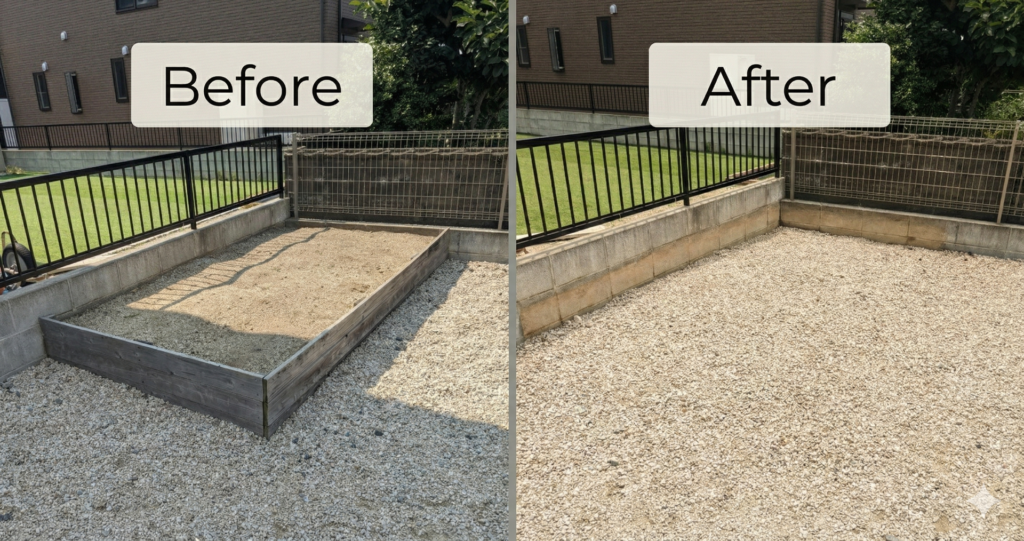 佐賀市西与賀で花壇の解体撤去・残土処分・砂利敷き直しを行った施工事例をご紹介。重機が入らない現場でも2名の手作業で半日で完了。費用や施工の流れも掲載。