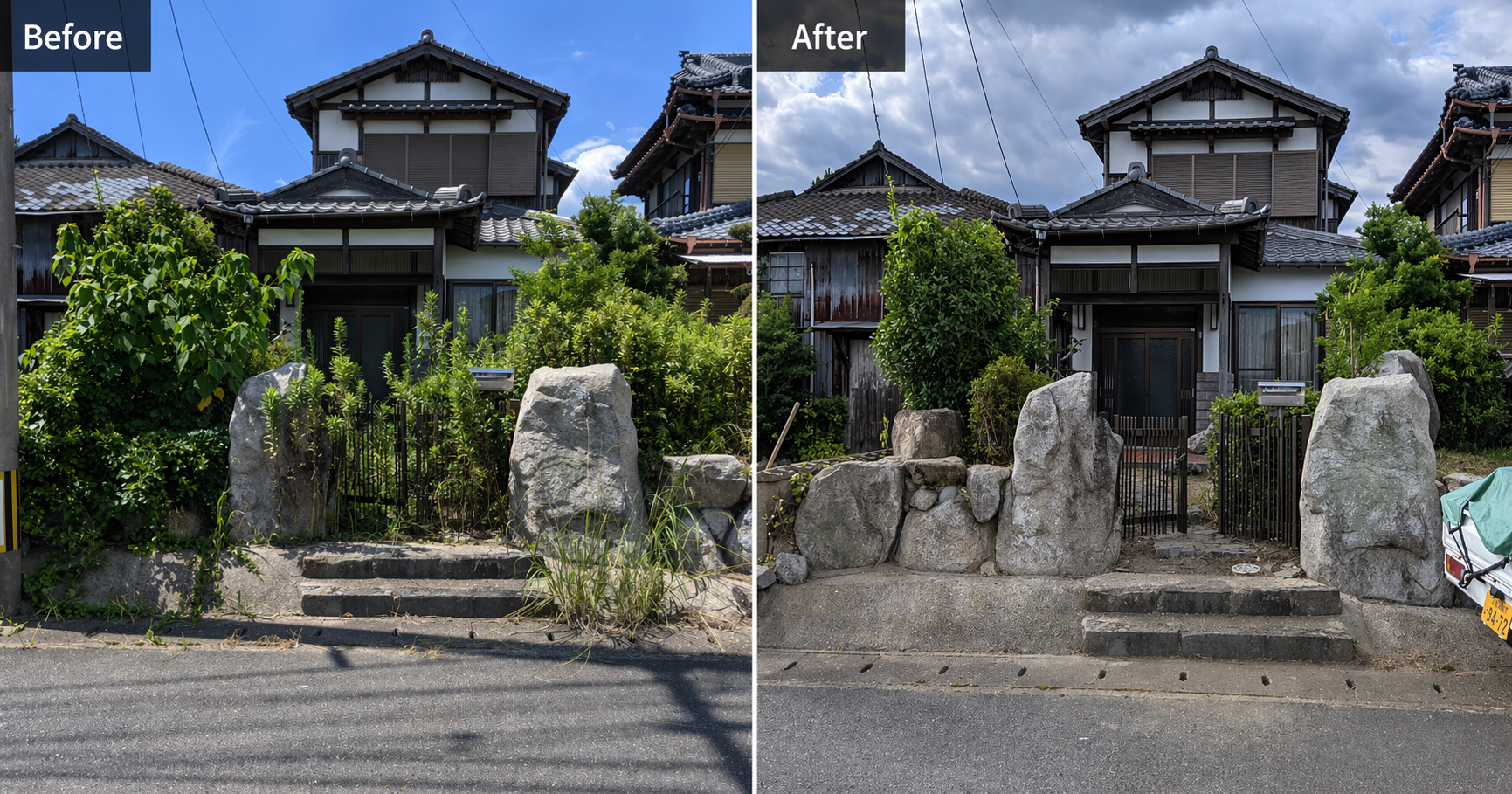 塀際や建物周辺の細部まできれいに仕上がっており、空き家全体の印象が大きく変わりました。定期的なメンテナンスにも取り組みやすい状態です。また、施工後はお客様に写真付きで作業完了をご報告しました。遠方にお住まいのお客様でも、しっかりと施工の様子をご確認いただけます。