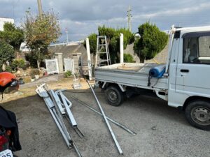 - カーポートの解体・撤去処分:屋根(波板)・柱・梁などをグラインダーで切断しながら解体し、軽トラで搬出・適切に処分しました。