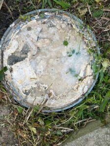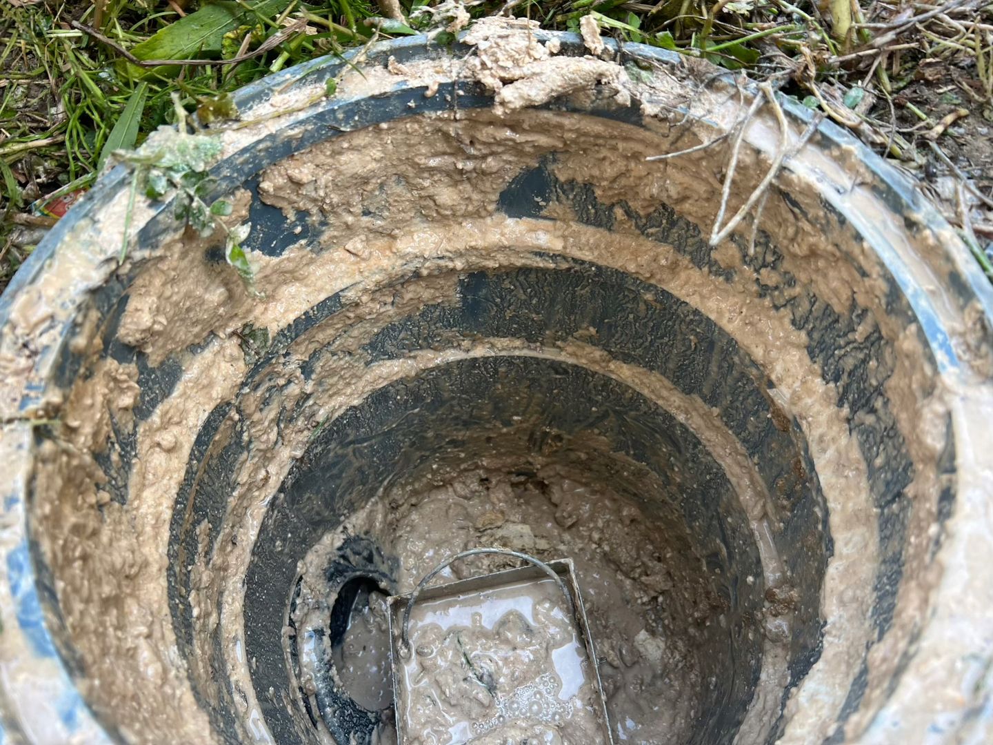 現地に伺ってクリーンますの中を確認したところ、白っぽい固着汚れやヘドロがびっしり溜まっており、フタを開けた瞬間から強烈な臭いがするほど劣化した状態でした。このまま放置すると、配管の奥まで詰まりが広がり、屋内での排水逆流につながる可能性もありました。