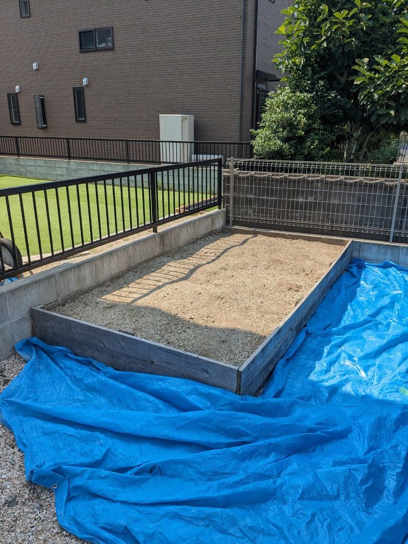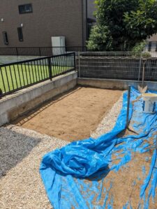 - 養生の徹底:撤去した木材や土が周囲に散らからないよう、作業前にブルーシートでしっかり養生しました。砂利スペースへの汚れの混入を防ぐための大事な一手間です。