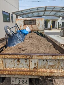 - 花壇内の土をスコップで掘り起こし、一輪車でダンプの荷台まで手作業で搬出する