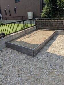 現地を確認すると、木製の枠組みで囲われた花壇が庭の一角を占めていました。経年劣化によって木枠の傷みが目立ち、土の表面は雑草が根付きやすい状態になっていました。花壇の周囲は既存の砂利スペースが広がっており、花壇部分だけが浮いた印象を与えていました。