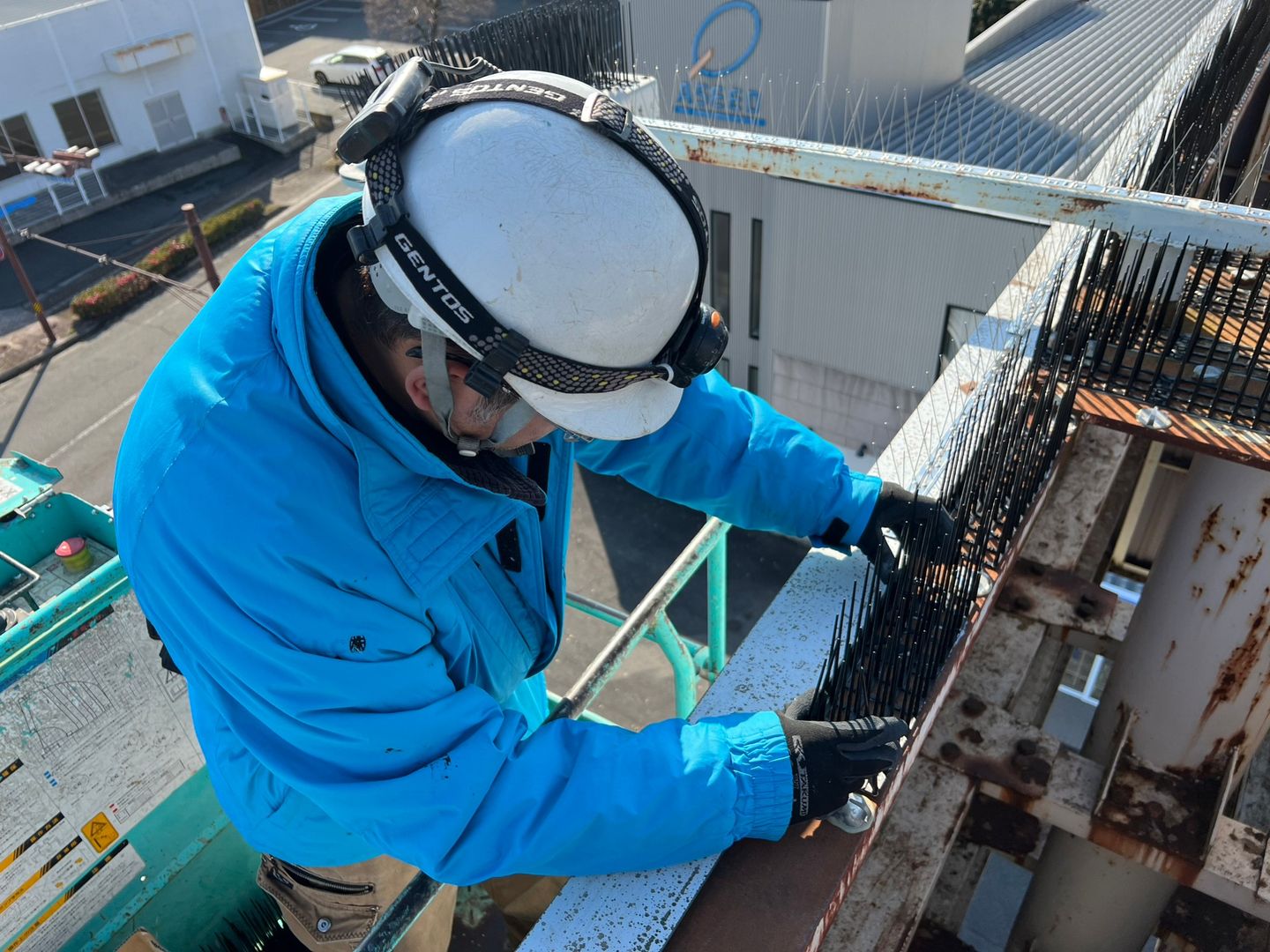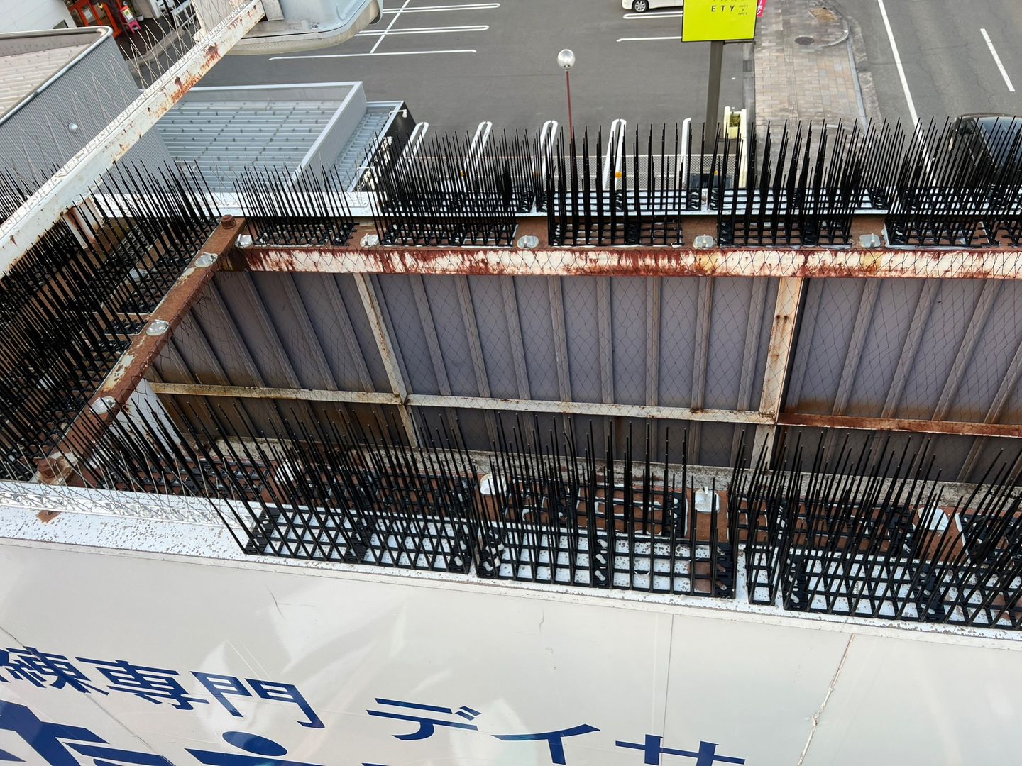 - 施工内容:高所看板への防鳥剣山取り付け・防鳥ネット取り付け