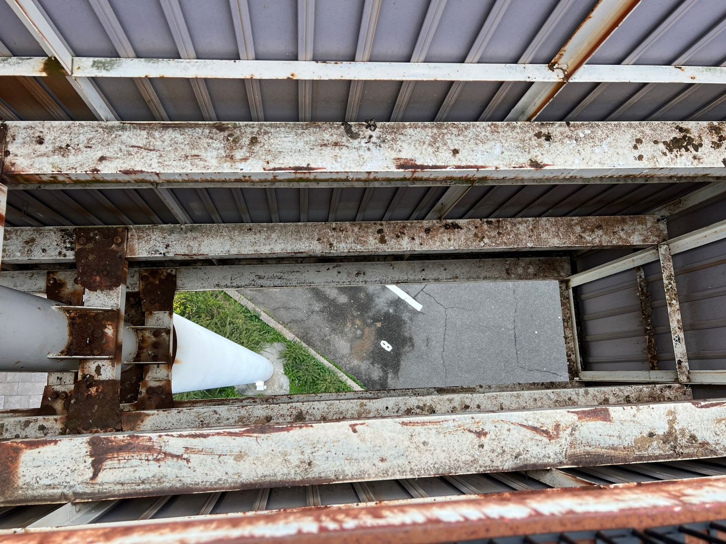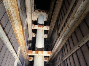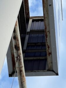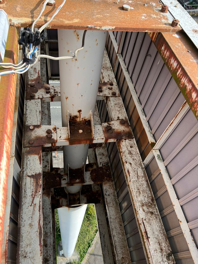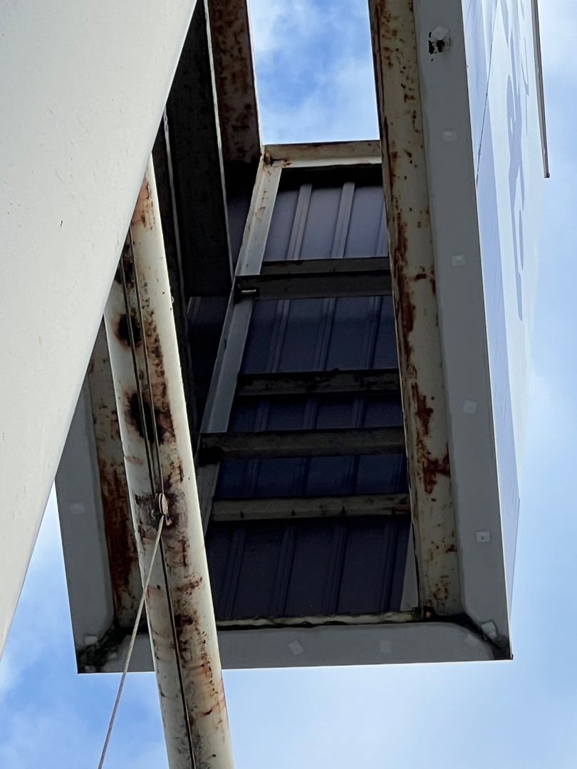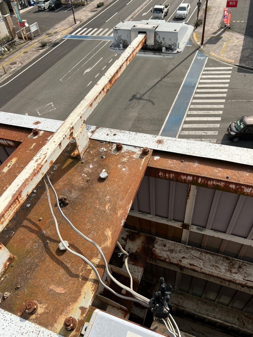 現地を確認すると、高所看板の上部や周辺が鳥の止まり場になっており、看板本体や周辺のフレーム・鉄骨部分にフンや汚れが付着していました。サビが出ている鉄骨部分もあり、全体として「管理が行き届いていない」印象を与えてしまう状態でした。