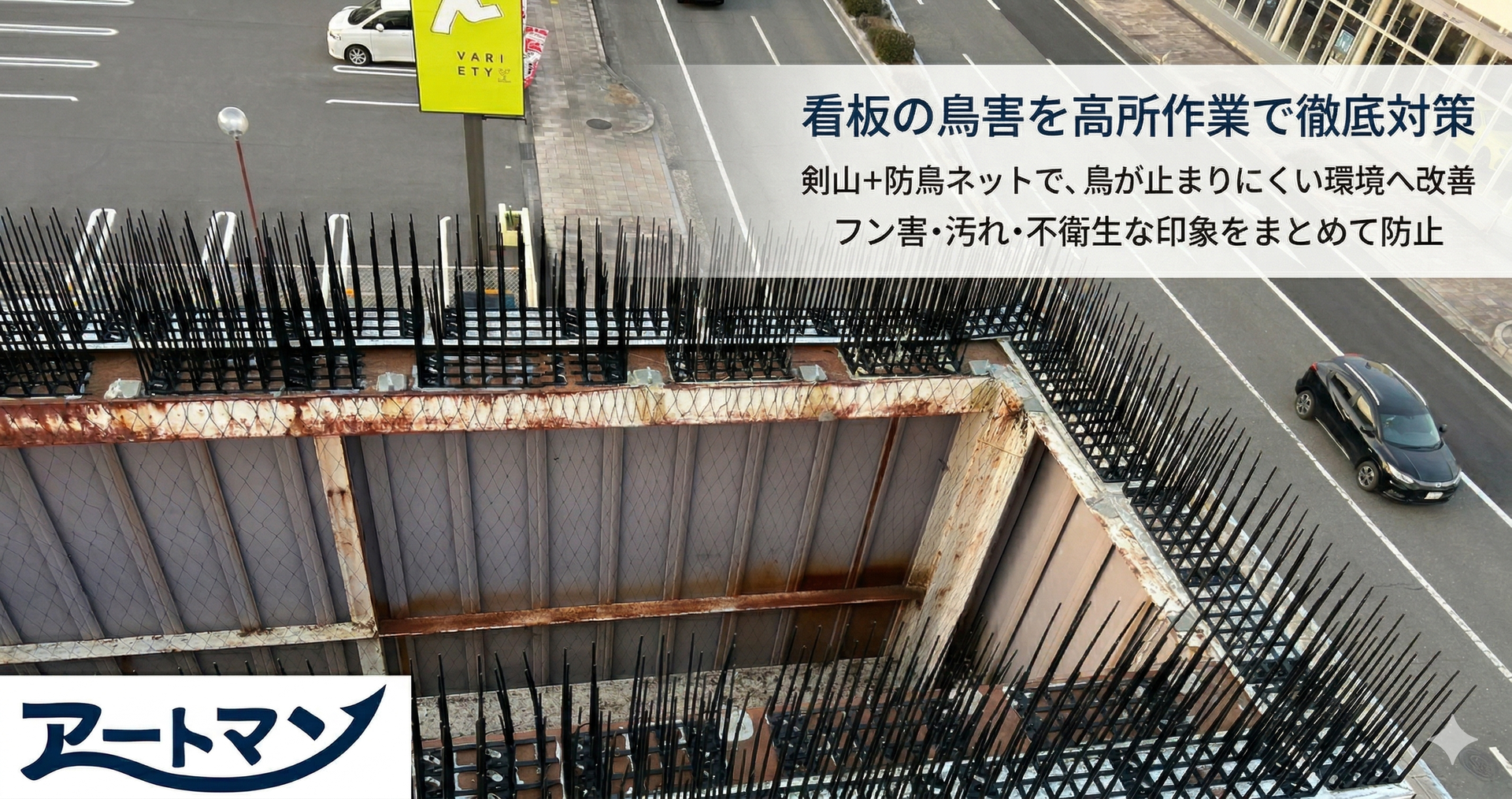 「看板に鳥が繰り返し集まってくる」「駐車場のフン害が続いている」「高所なのでどこに頼んでいいかわからない」——そんな方は、ぜひアートマンへご相談ください。