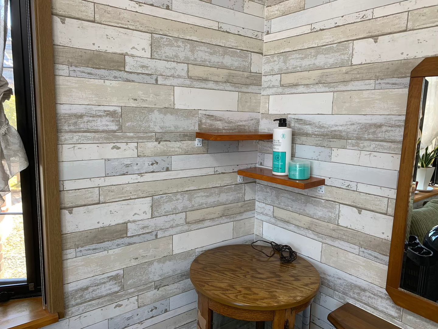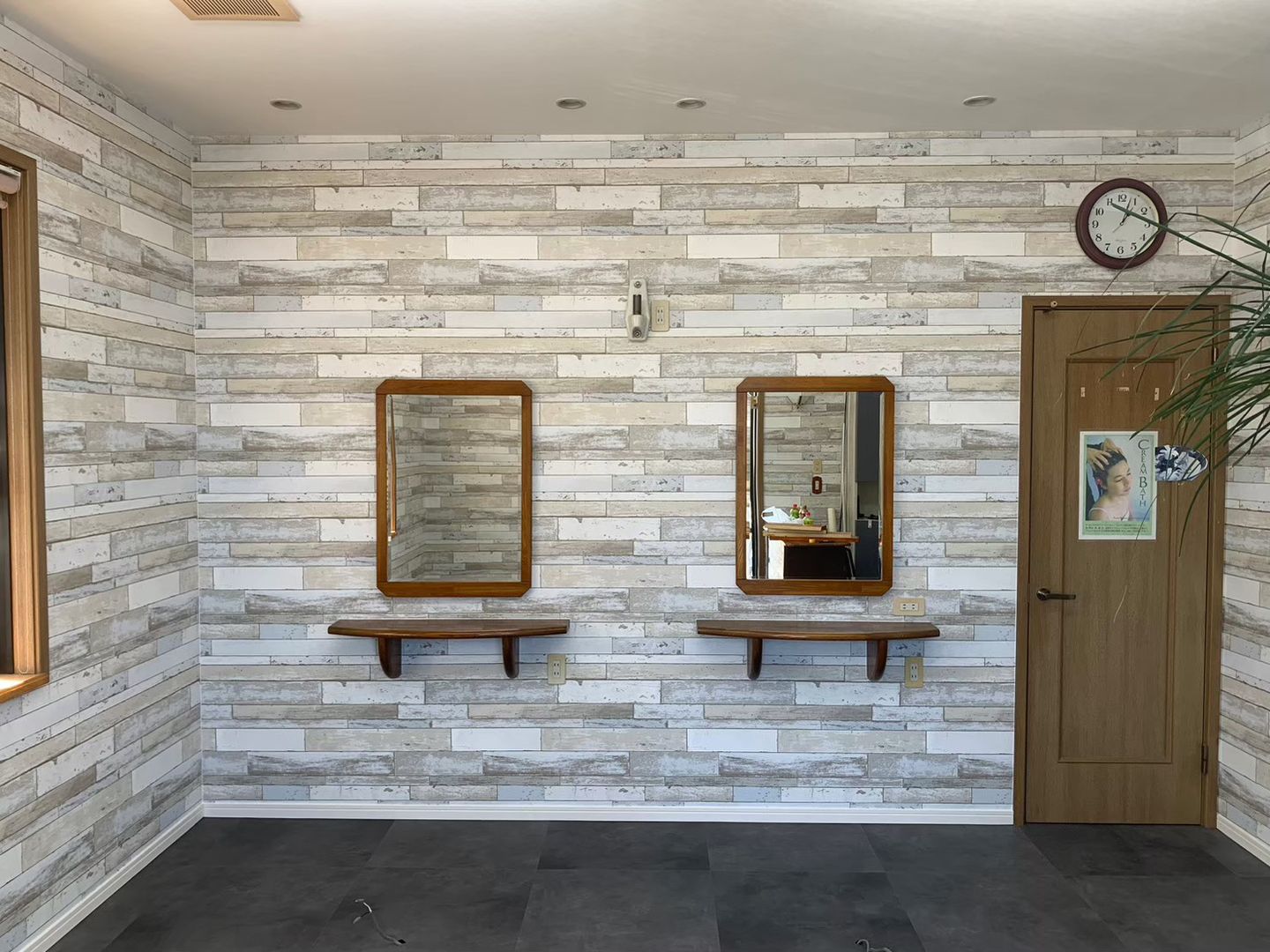 施工完了後、店内は統一感のある洗練された空間へと生まれ変わりました。壁・天井・床・トイレがすべて新しくなり、美容室としての世界観が一目で伝わる雰囲気になりました。