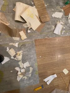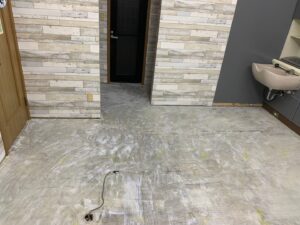 施工の過程では、いくつかの難しい場面もありました。長年使われてきた古いクロスやクッションフロアが下地にしっかり固着しており、剥がす作業にかなりの手間がかかりました。また、美容室には重量のある施術チェアや機器が多く、取り外しと取付けには複数人での対応が必要でした。