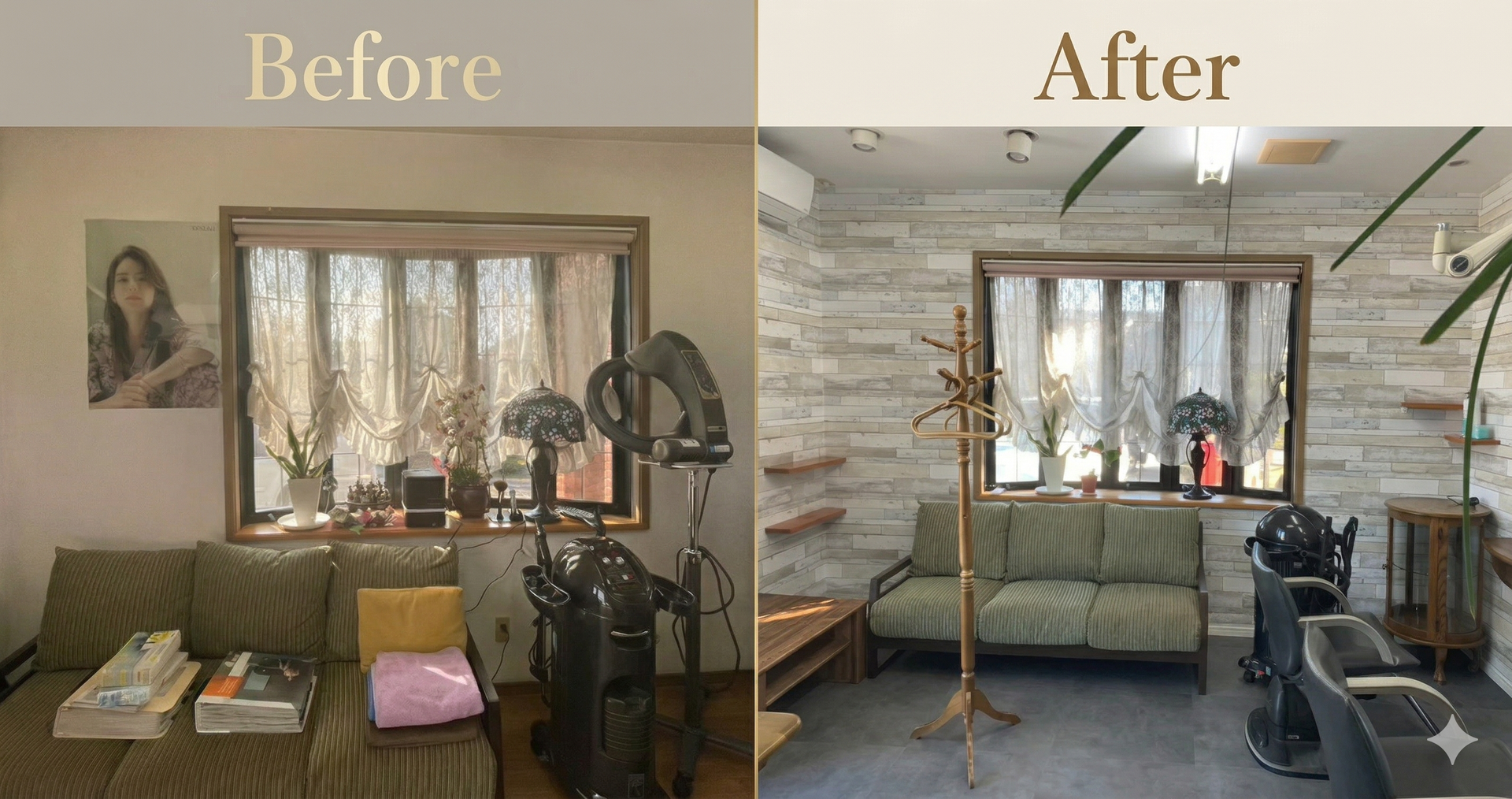 - クロス工事:店内全体(壁・天井)の壁紙を張り替え。統一感のあるデザインを選定し、美容室らしい清潔感と洗練感を演出
